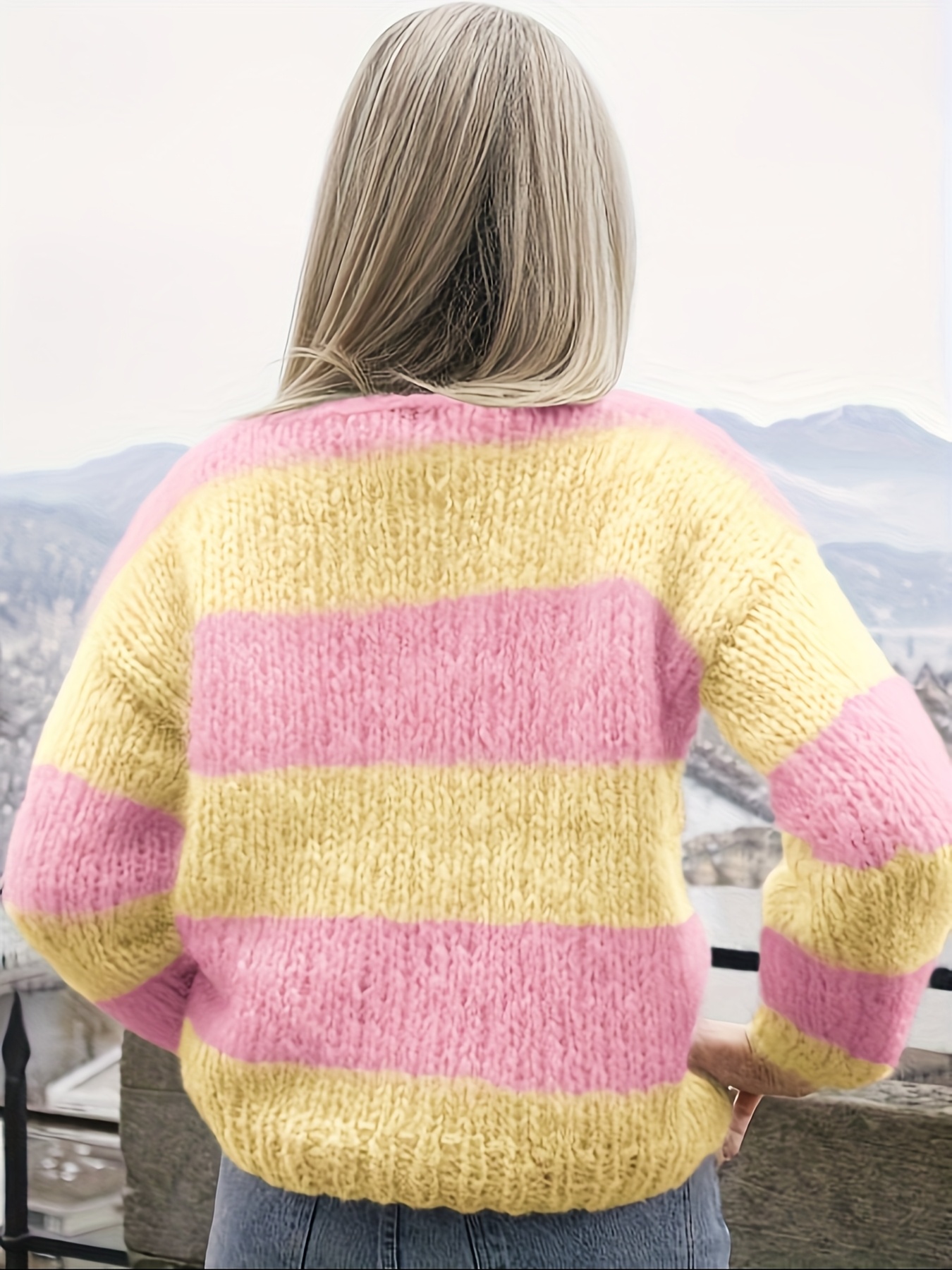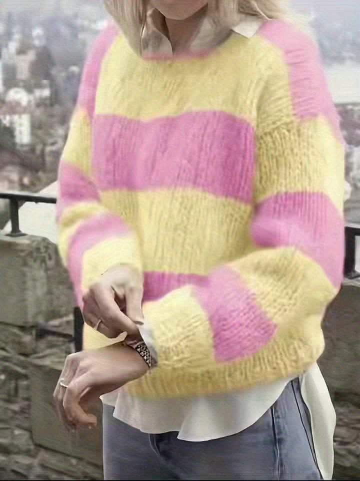 Plus Size - New Striped Color-Blocked Sweater for Autumn And Winter, a Loose-Fitting Plus-Size Rainbow Sweater for Women That Makes You Look Younger.