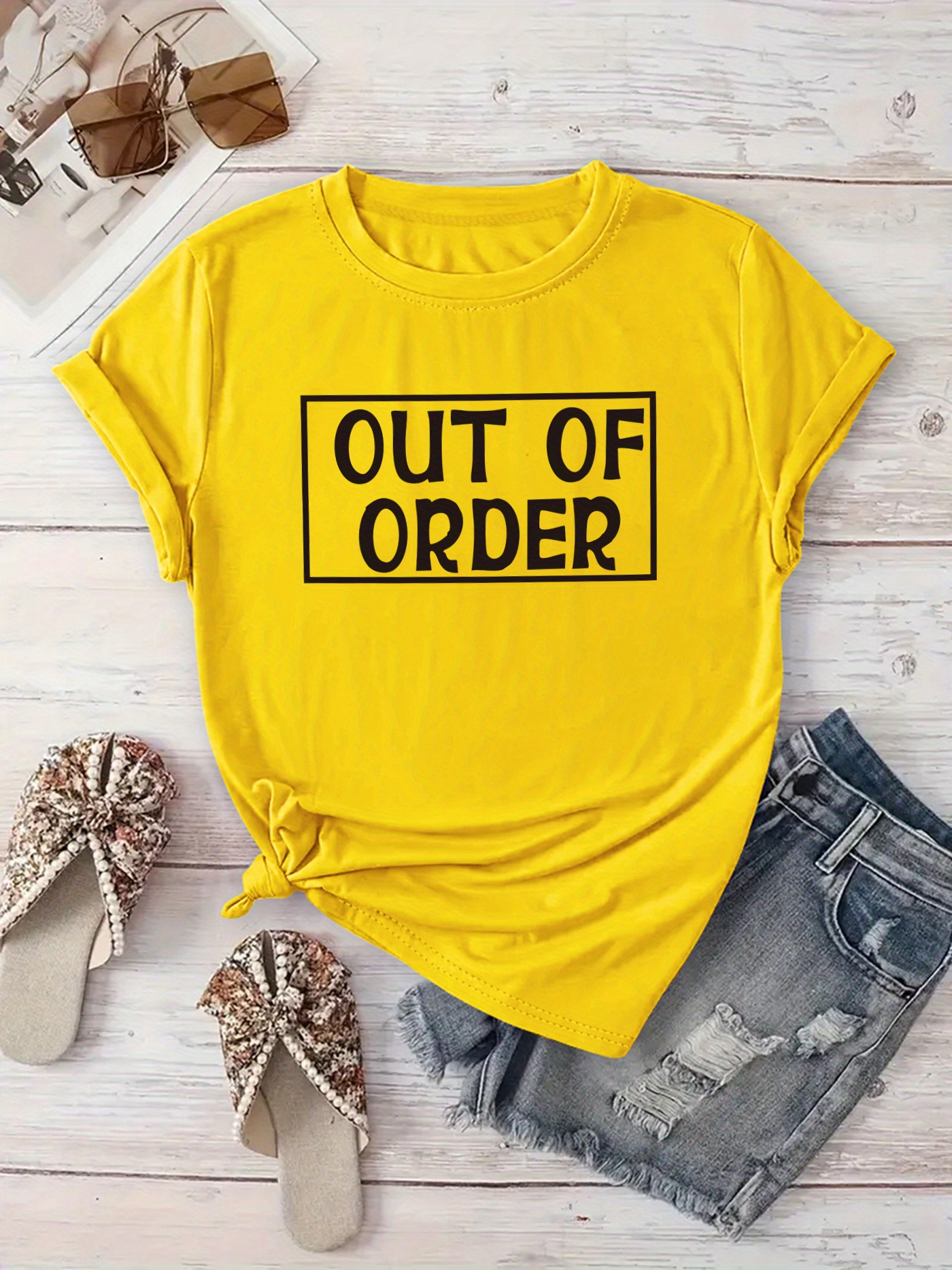 Women's Casual Short-Sleeve T-Shirt with "OUT OF ORDER" Print, Round Neck, Geometric Pattern, Machine Washable, Spring/Summer Vacation Wear, Regular Fit, Dark Grey, Relaxed Fit Top | Geometric Print Tee | Stylish Details