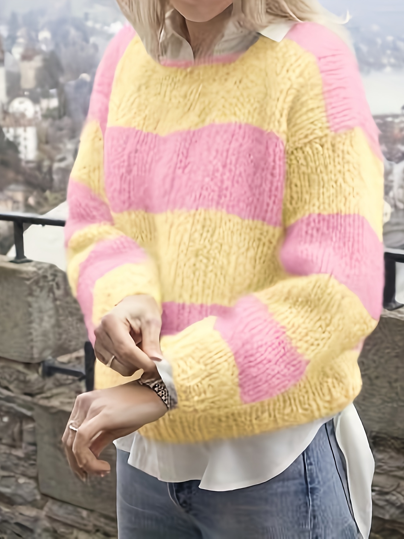 Plus Size - New Striped Color-Blocked Sweater for Autumn And Winter, a Loose-Fitting Plus-Size Rainbow Sweater for Women That Makes You Look Younger.