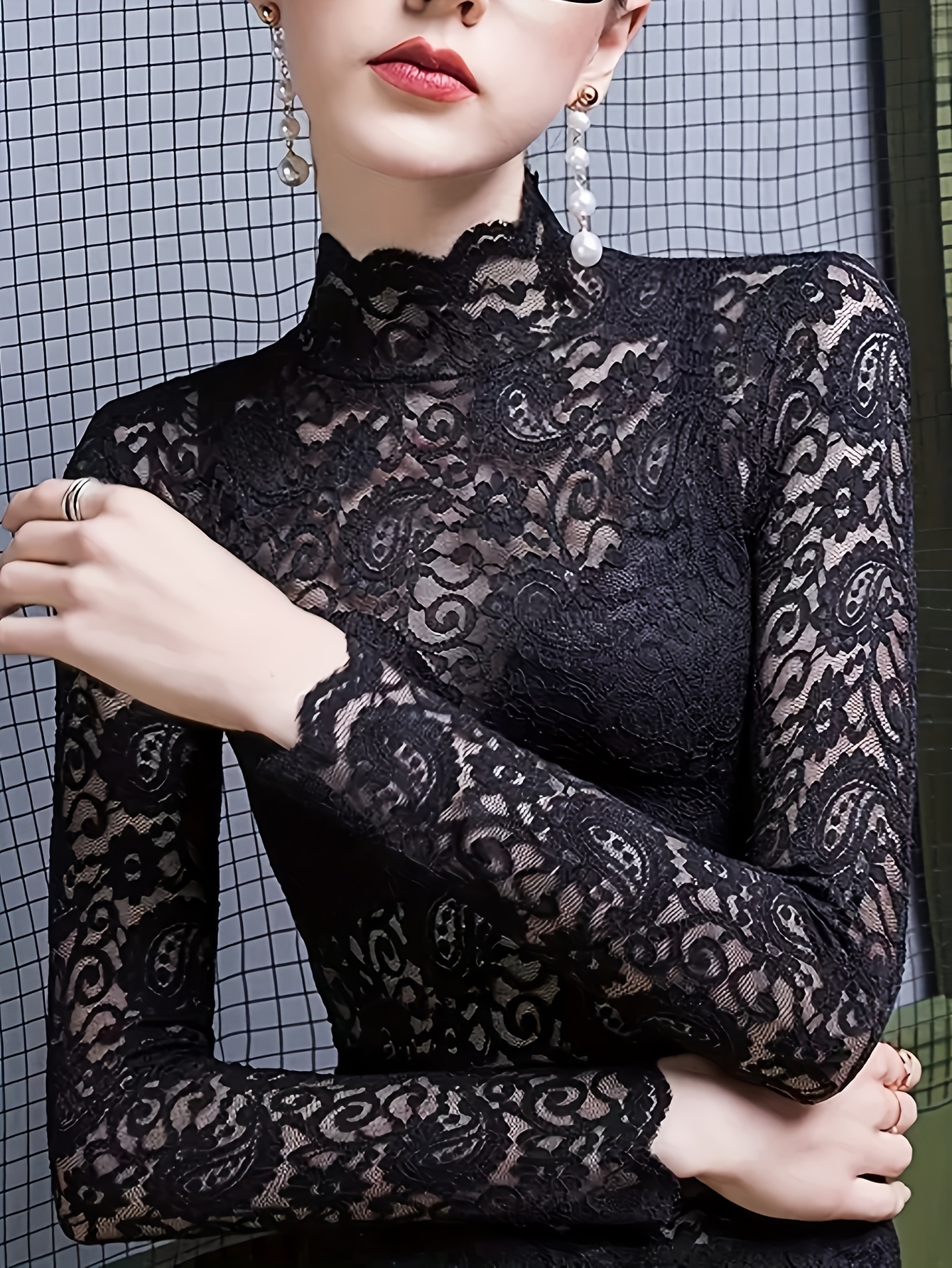 Set of 2, Solid Color Lace Tops, Featuring a Mock Neck And Elegant Long Sleeves, Perfect As a Base Layer for Spring And Autumn, Women'S T-Shirt.